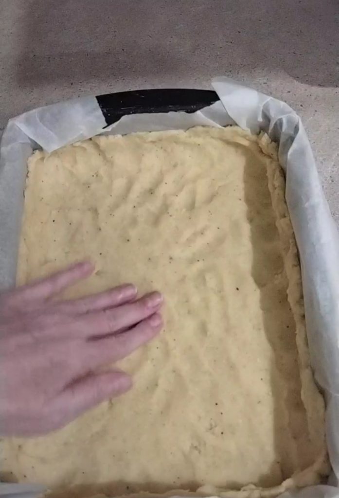 Forrad con papel de horno una bandeja rectangular de 31×23 cm. Cubridla con 3/4 de la mezcla de patata, procurando nivelarla bien; cubrid también parte de los bordes.