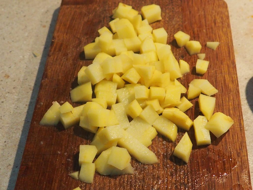 • Lavad, pelad las patatas y cortadlas en cubos.