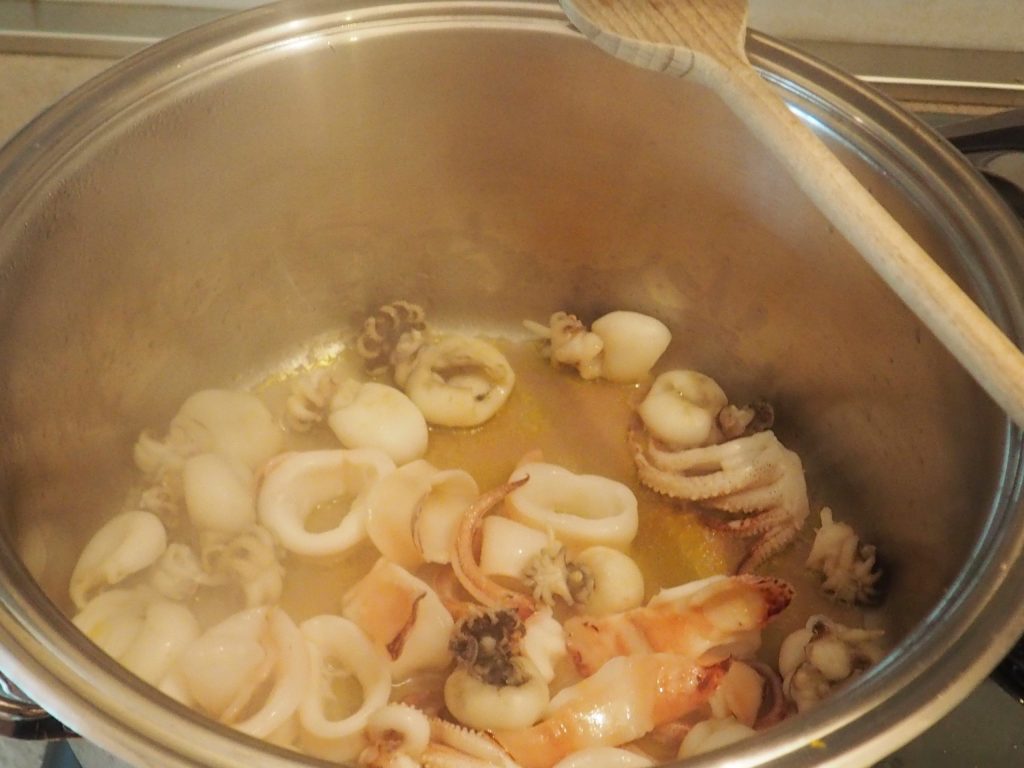 Corta los calamares en rodajas, los pulpitos en trozos de 2/3 centímetros, las sepias eran pequeñas así que las dejé enteras.
