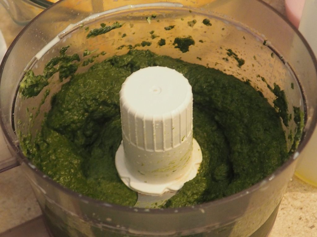 Pon las espinacas en una batidora con 100 ml de leche y tritúralas bien.