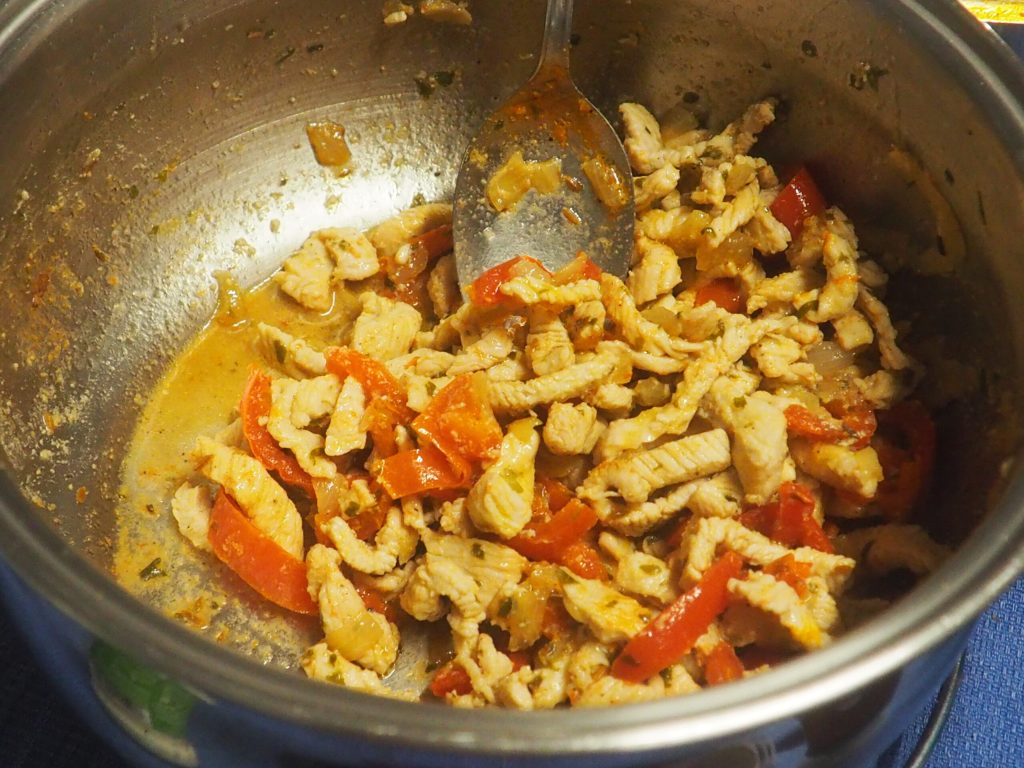 En una sartén poned un poco de aceite, el comino y dejadlo dorar ligeramente. Laváis, limpiáis tanto la cebolla como el pimiento y los cortáis en tiras. Añadidlos en la sartén, dejad dorar durante unos minutos y luego verted el pollo con la marinada y cocinad durante unos 15/20 minutos.