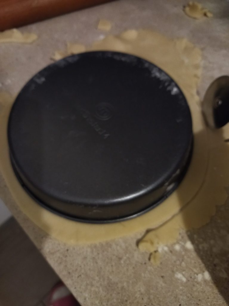 Extiende la masa con un rodillo hasta un grosor de aproximadamente 5-6 mm. Para conseguir la misma altura, ayúdate colocando dos palillos chinos a los lados de la masa mientras la extiendes. Reserva un trozo de masa, lo usaremos después. Voltea un molde de unos 20 cm de diámetro sobre la masa extendida y con una rueda corta un círculo de aproximadamente 2 cm más grande que el molde.