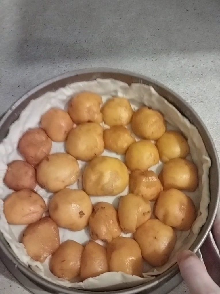 Ahora lava los melocotones, pélalos, divídelos por la mitad, quita el hueso y colócalos en el molde con la parte del hueso hacia abajo, tratando de formar círculos concéntricos.