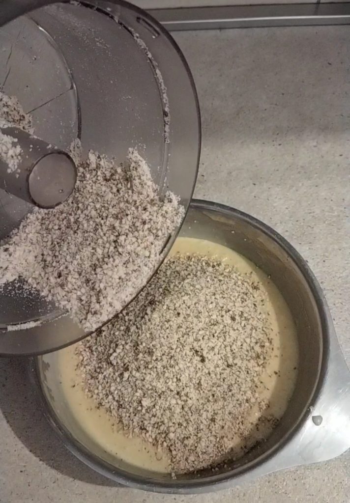 Actívala hasta que se reduzcan a harina. También puedes dejarlas un poco gruesas, dará el efecto crujiente a tu tarta. Ahora añádelas a la mezcla de huevos.