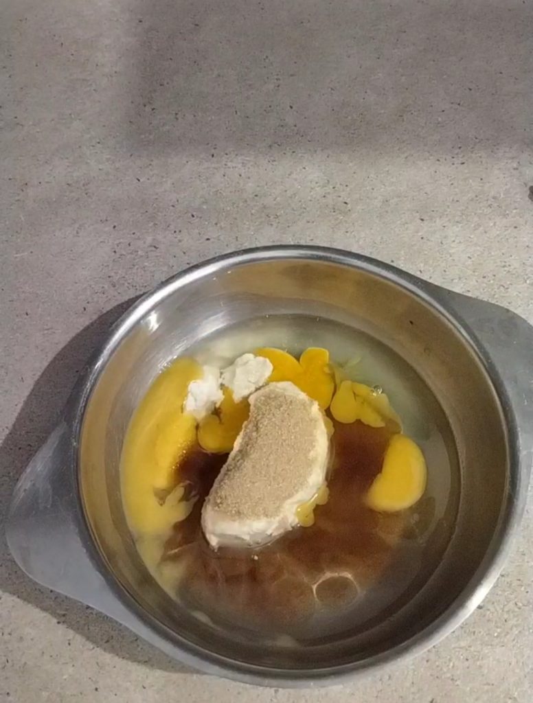 En un bol mezcla los huevos, el azúcar, el mascarpone y la mantequilla previamente derretida en el microondas en un vaso.