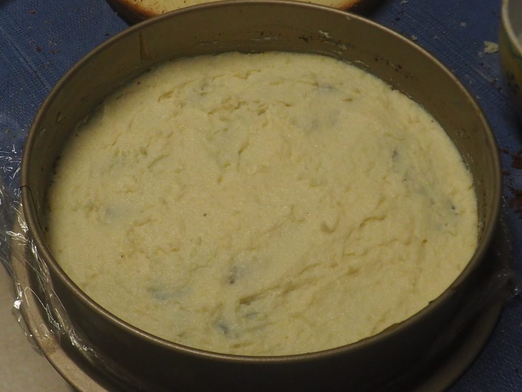 En este punto saca del congelador el molde, pon una capa con la mitad de la crema y ricotta y pon en la nevera.