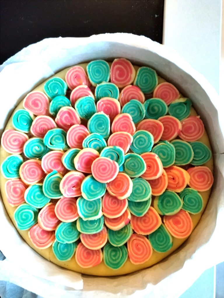 Cubrid el fondo de la tarta con la mermelada, doblando los bordes hacia adentro y luego comenzad a cubrir con las serpentinas. Yo puse los colores alternados, pero podéis elegir cómo disponerlas.