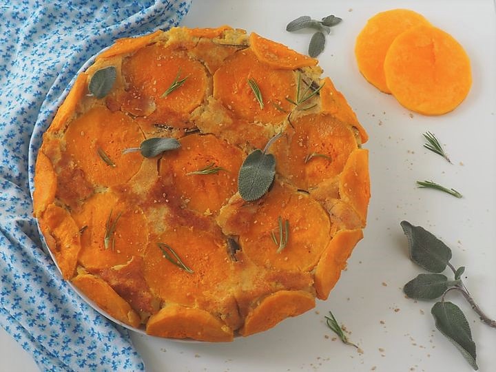 La Tarta invertida de calabaza con garbanzos es una deliciosa tarta salada, con un sabor delicado que te conquistará seguro.