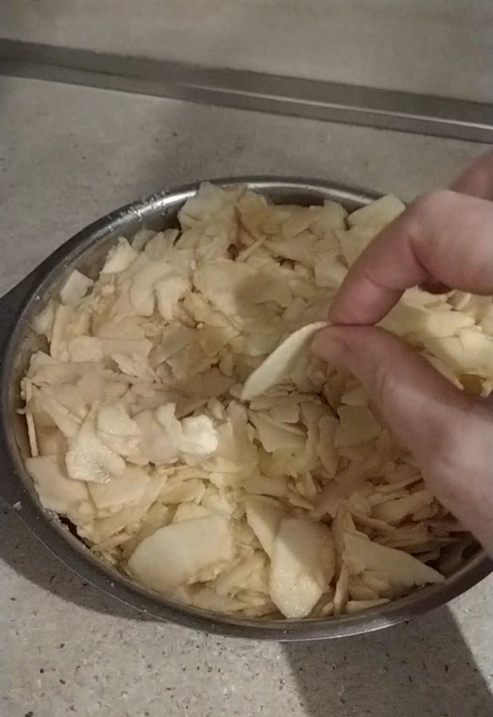 Transfiere la mezcla de manzanas a un molde de 22 cm de diámetro (o de 24 cm si la prefieres más ancha, la de 22 cm es la medida justa) engrasado y enharinado.