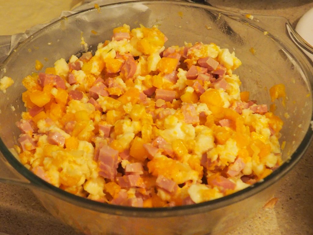 Cortar la mozzarella escurrida y la mortadela en cubos pequeños y añadirlos a la calabaza, agregar también el parmigiano y mezclar bien.