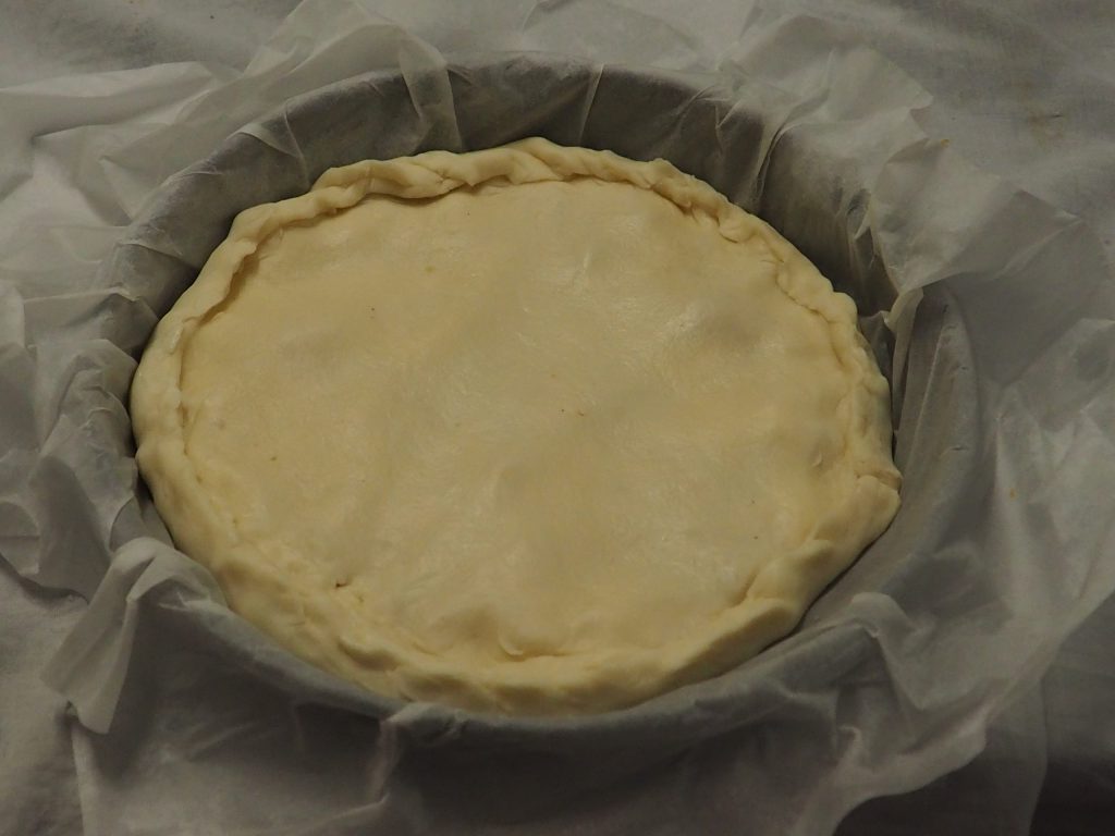 Cubrir con papel de horno un molde de 28 cm, colocar encima la primera masa de hojaldre, cubrir con la mezcla. Cubrir todo con la otra masa de hojaldre, o si prefieres, corta tiras y crea una rejilla cruzada.