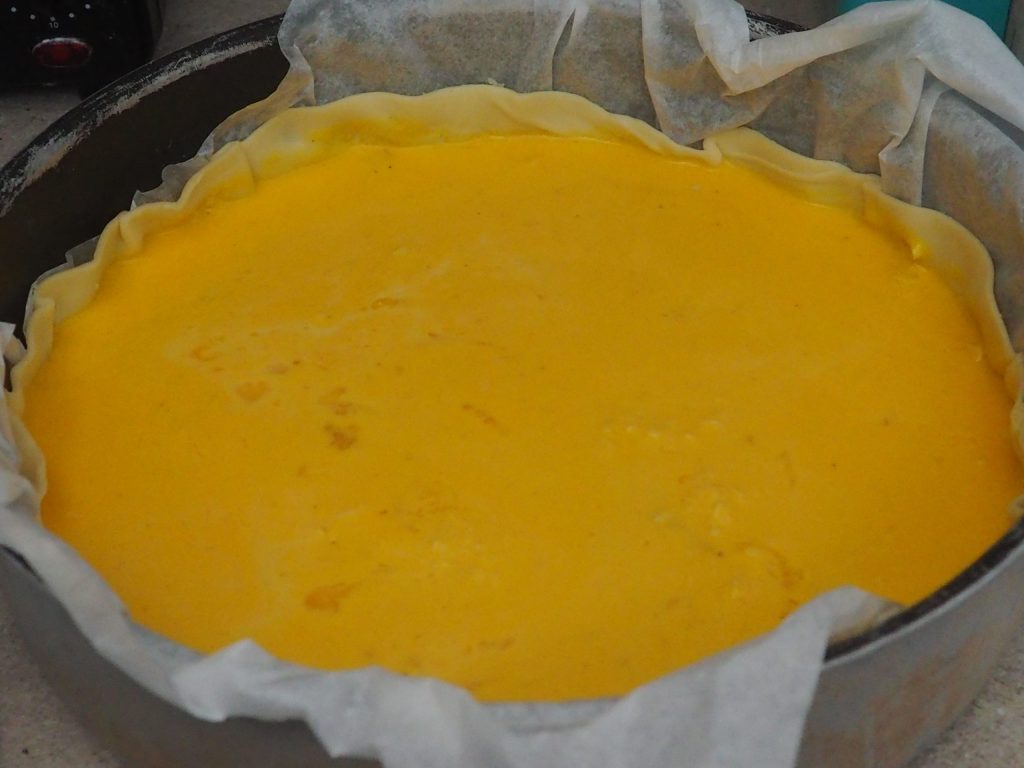 • Forrad con papel de horno un molde de 28 cm de diámetro, cubridlo con la masa de hojaldre.