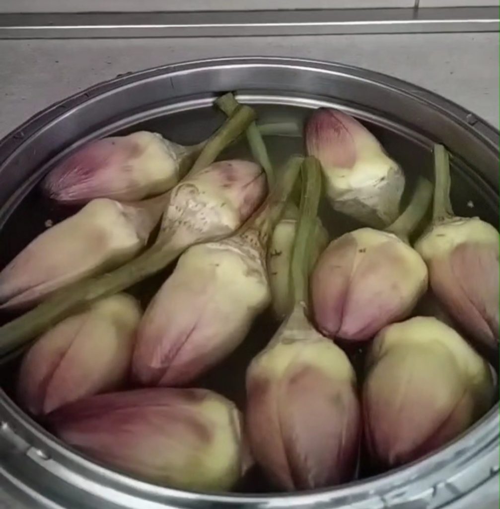 Limpia las alcachofas dejando un trozo del tallo y ponlas en agua con el jugo y la cáscara de un limón.