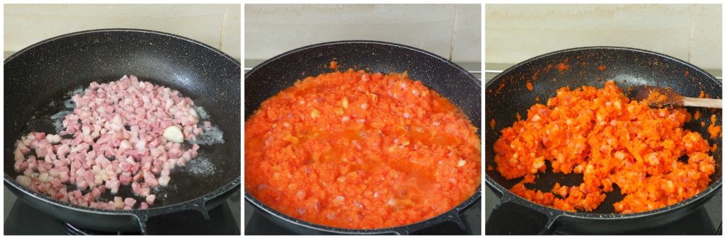 En una sartén amplia, cocina la panceta cortada en dados hasta que esté dorada.