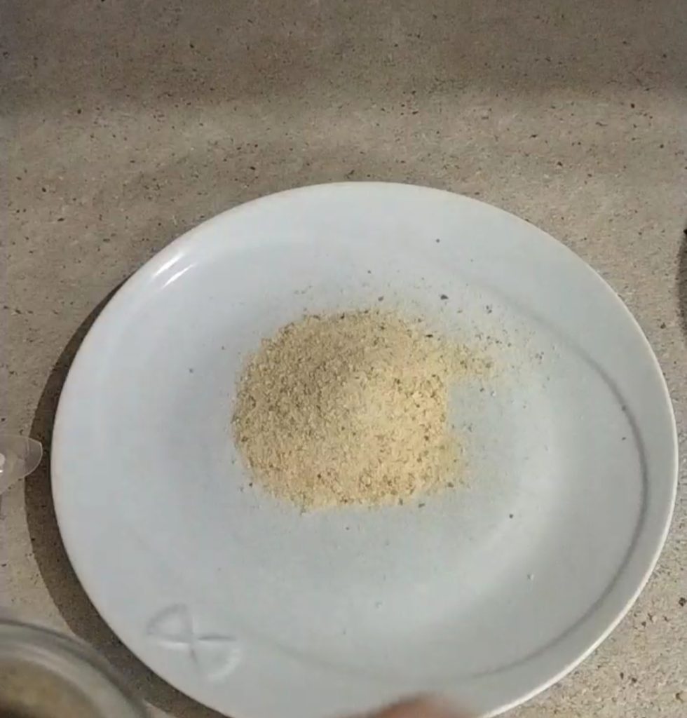 Pon el pan rallado en un plato. Si quieres puedes sazonarlo con especias al gusto (por ejemplo, pimentón dulce, cúrcuma) o con romero finamente picado.