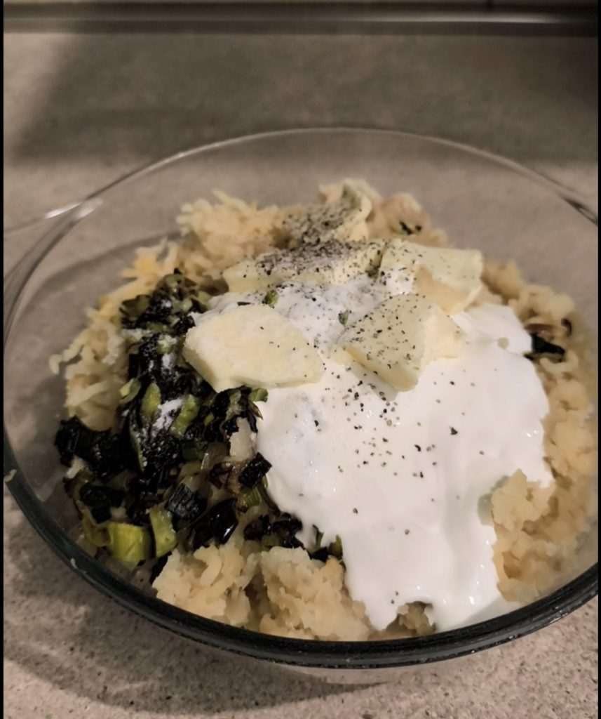 Ahora añadid a las patatas machacadas la hierba de San Pedro, el puerro rehogado, la mantequilla, la mitad de la nata para cocinar, un poco de sal, nuez moscada y pimienta molida. Mezclad bien todos los ingredientes.