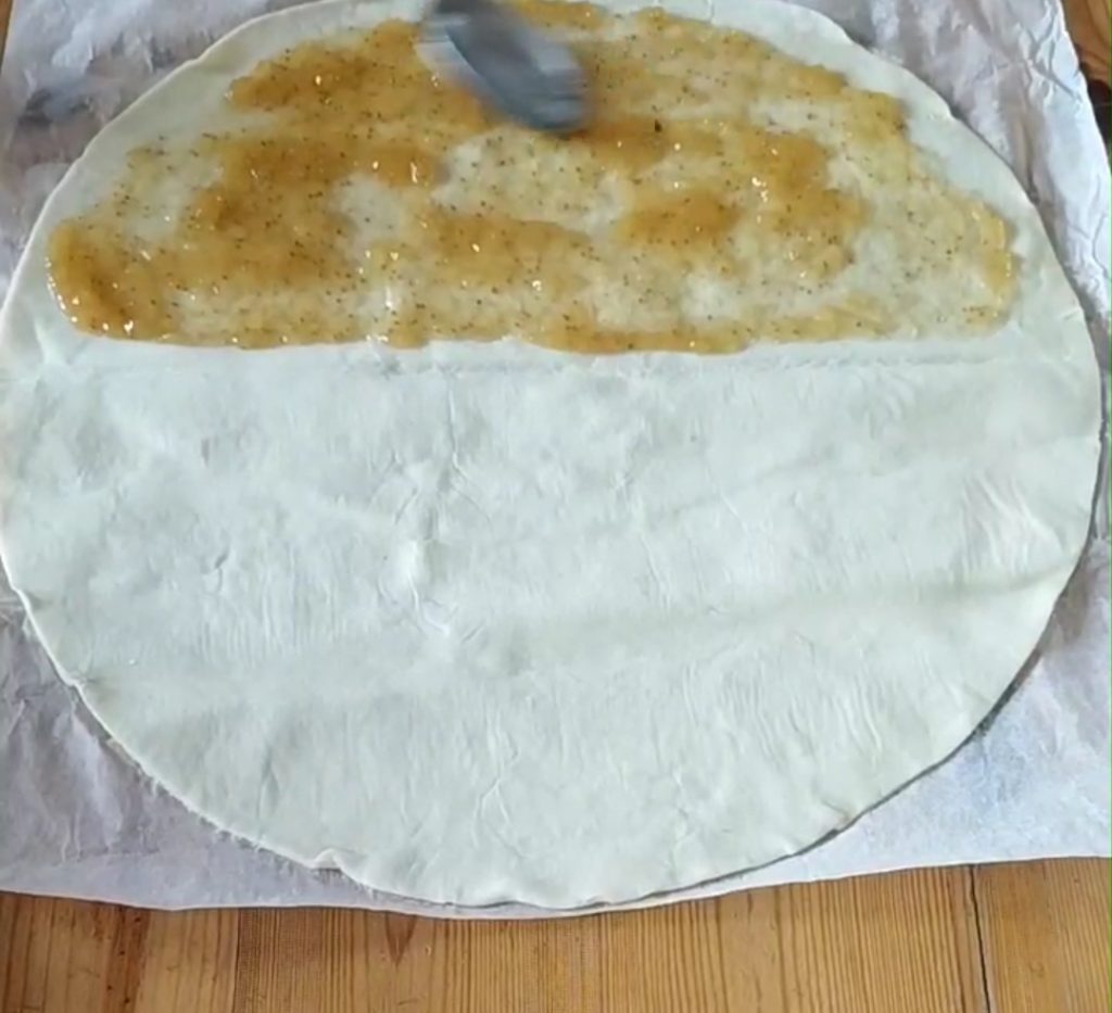 Extiende el hojaldre redondo y unta la mermelada en una mitad.