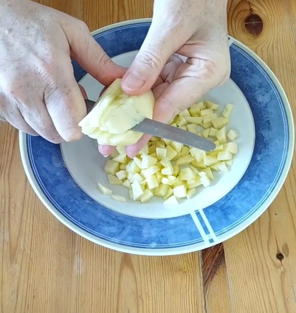 Lava la manzana, pélala y córtala en dados bastante pequeños. Ponlos en un recipiente, si prefieres puedes agregar un poco de jugo de limón y azúcar. Yo las dejé al natural.