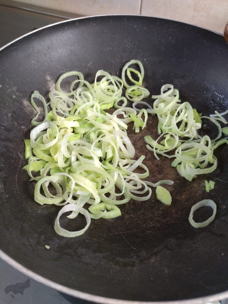 En una sartén grande, pon 20 g de mantequilla y los puerros, déjalos cocinar a fuego lento durante unos 10 minutos, añade sal y mezcla. Los puerros deben estar bien cocidos. Mientras tanto, prepara el caldo calentando un litro de agua con un corazón de caldo de carne.