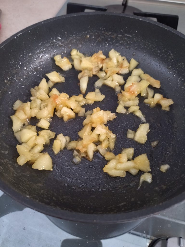 Mientras tanto, prepara también la manzana caramelizada. Lava, pela, quita el corazón y corta la manzana en cubitos pequeños. En una sartén, pon el agua, el azúcar y deja que se disuelva a fuego medio. Añade los cubitos de manzana y cocina durante dos o tres minutos.