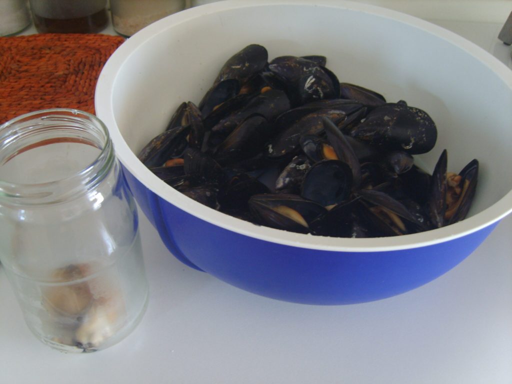 Abrimos los mejillones en una sartén a fuego alto con tapa, apenas se abran los sacamos de la sartén y los ponemos en un bol, no los cocinemos mucho para que no se vuelvan gomosos.