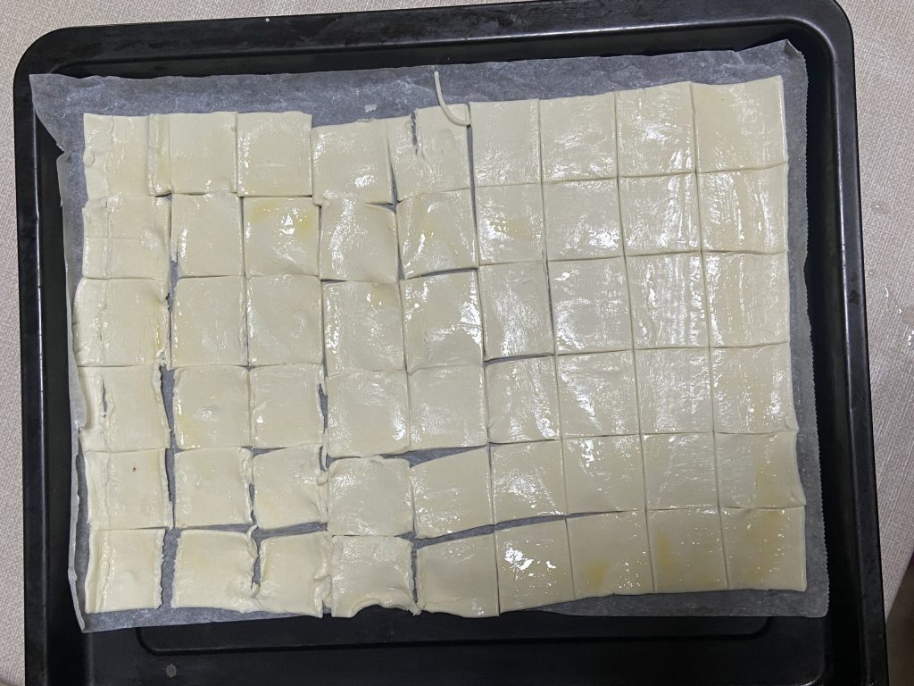 Pincelamos la superficie del hojaldre con la yema de huevo batida y con la ayuda de un cuchillo o una rueda cortapasta cortamos 9 tiras verticales y 6 horizontales como se muestra en la foto. Así obtendréis 56 cuadraditos.