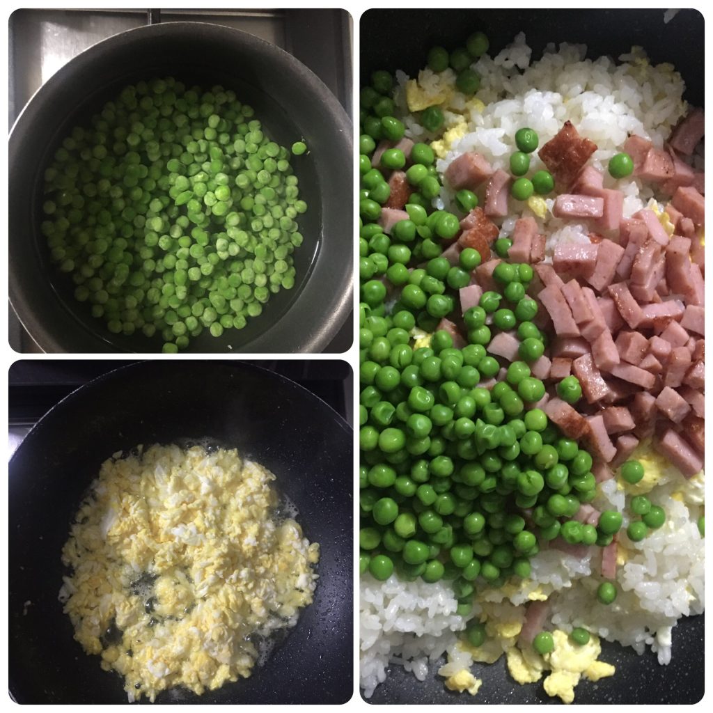 • Añadimos los guisantes previamente cocidos y el jamón cortado en cubitos y mezclamos bien.