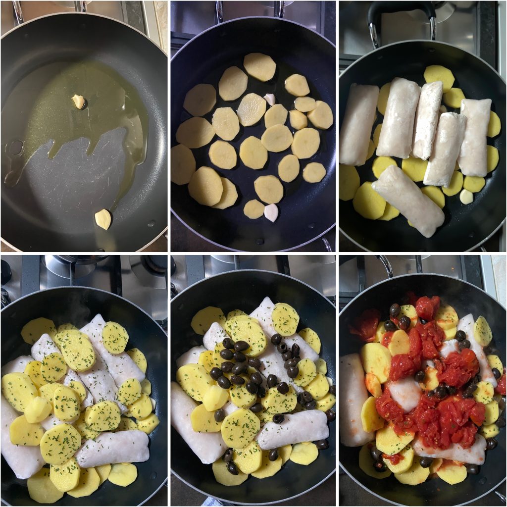 Añadimos el pescado congelado, las patatas restantes, las aceitunas, los tomates pelados, salamos, añadimos el orégano, el perejil y el medio vaso de agua y cocinamos tapado a fuego medio durante unos 40 minutos.