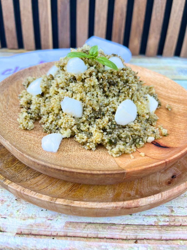 Nuestro Cous cous con pesto y bolitas de mozzarella está listo.