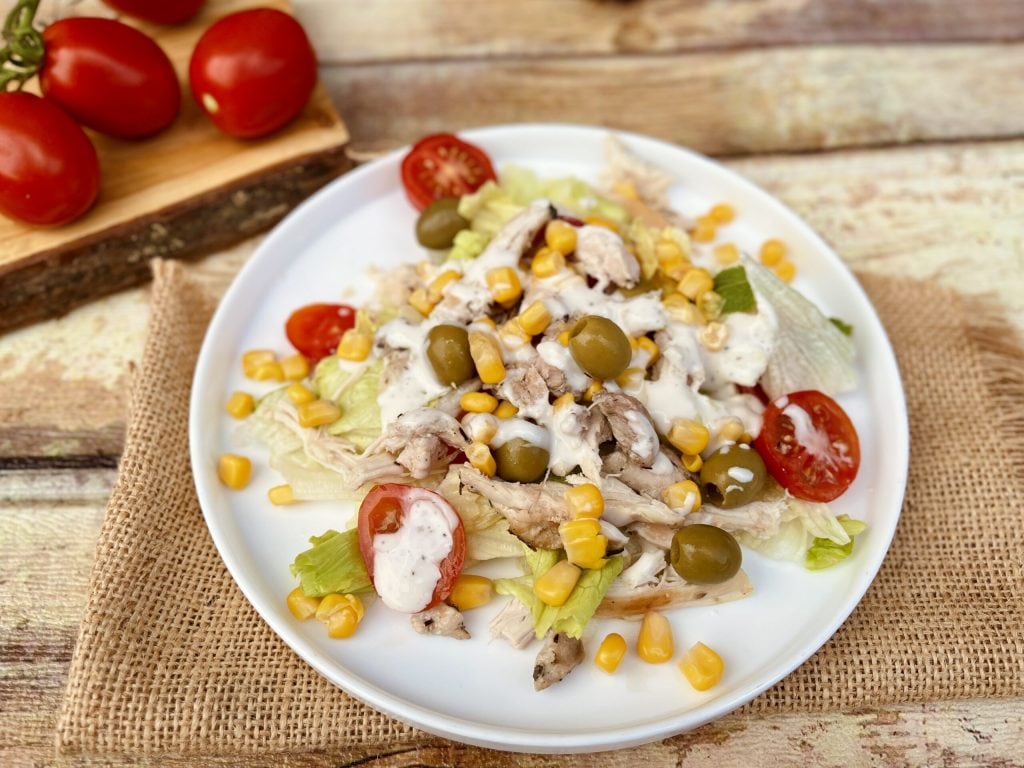 En esta receta te muestro cómo prepararla en pocos y sencillos pasos, con ingredientes frescos y genuinos: lechuga iceberg, tomates cherry, maíz dulce, aceitunas verdes y pechuga de pollo a la parrilla. ¿El toque extra? La salsa de yogur ligera y aromática que la hace irresistible!