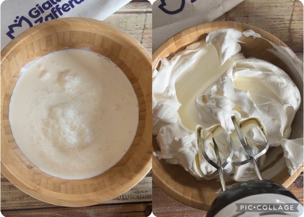 En un bol grande, montamos la nata fría junto con el azúcar glas y la leche condensada hasta obtener una mezcla densa y espumosa.