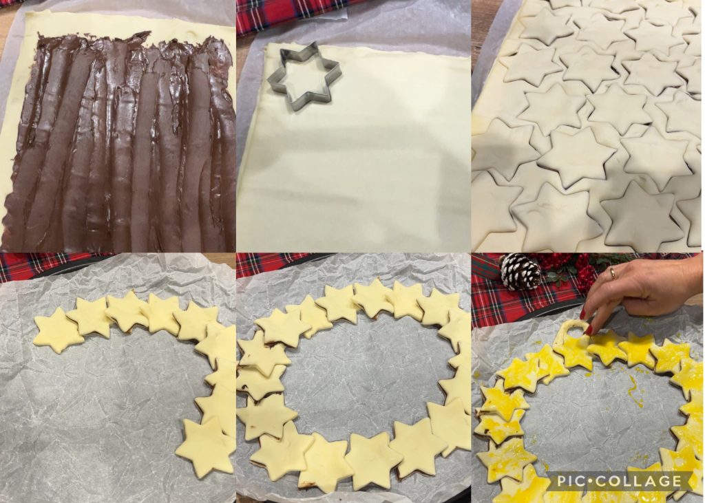 Colocamos las estrellitas en una bandeja cubierta con papel de horno, creando un gran círculo y superponiendo ligeramente las puntas.