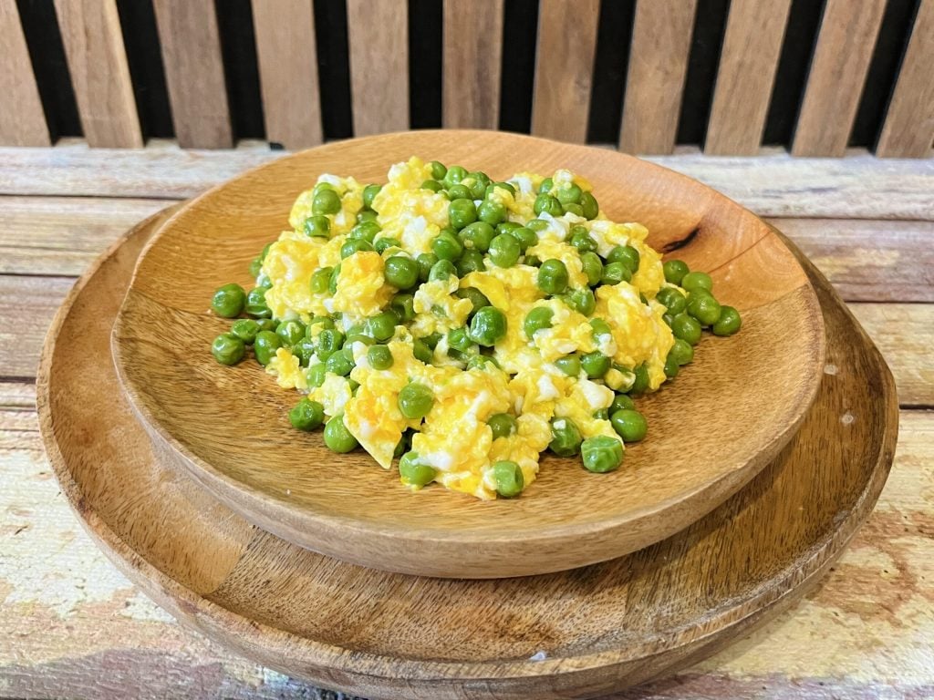 Nuestros Huevos revueltos con guisantes están listos. ¡Llevémoslos inmediatamente a la mesa con una buena rebanada de pan!