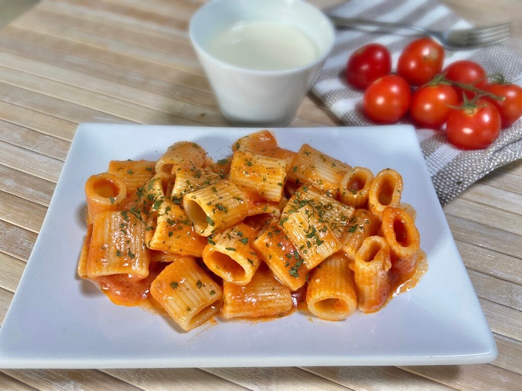 Mezze maniche con tomatitos y bechamel