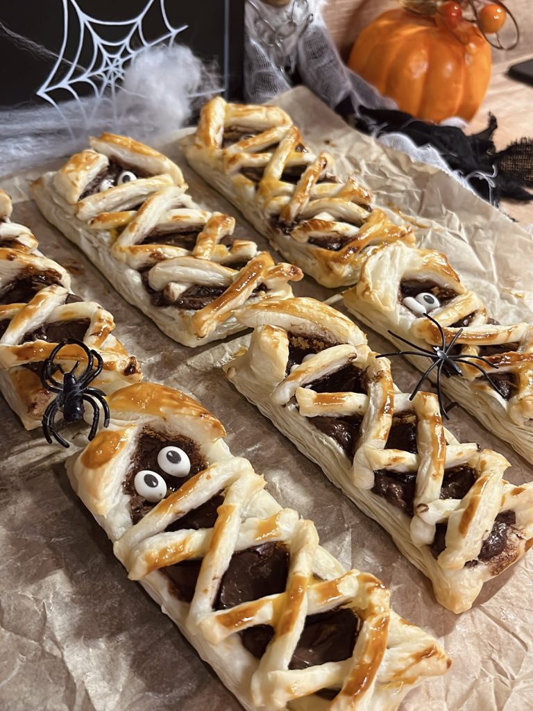 Nuestras momias de hojaldre con Nutella están listas. Sacamos del horno y dejamos enfriar, luego añadimos los ojitos de azúcar o dos gotas de chocolate para dar vida a nuestras momias!