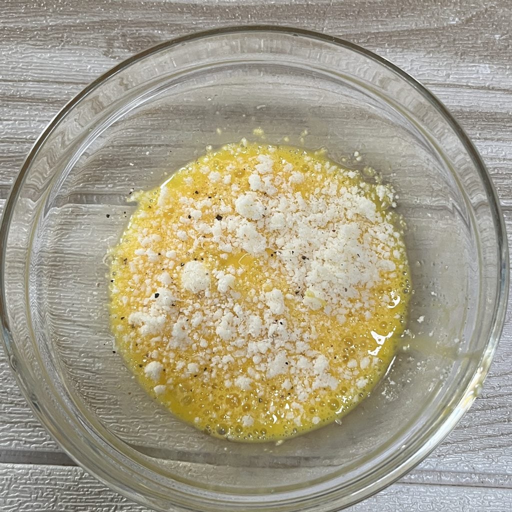 En un bol batimos los huevos con el queso parmesano rallado, sal y pimienta negra hasta obtener una mezcla homogénea.