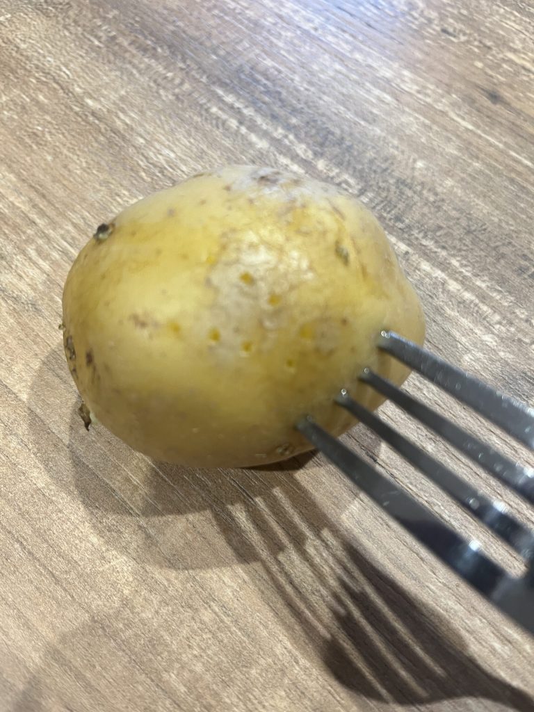 Cocinamos a 800 vatios durante unos 7 minutos. Comprobamos la cocción pinchando con un tenedor: si las patatas están todavía un poco duras, añadimos 30 segundos cada vez hasta que estén blandas en el centro.