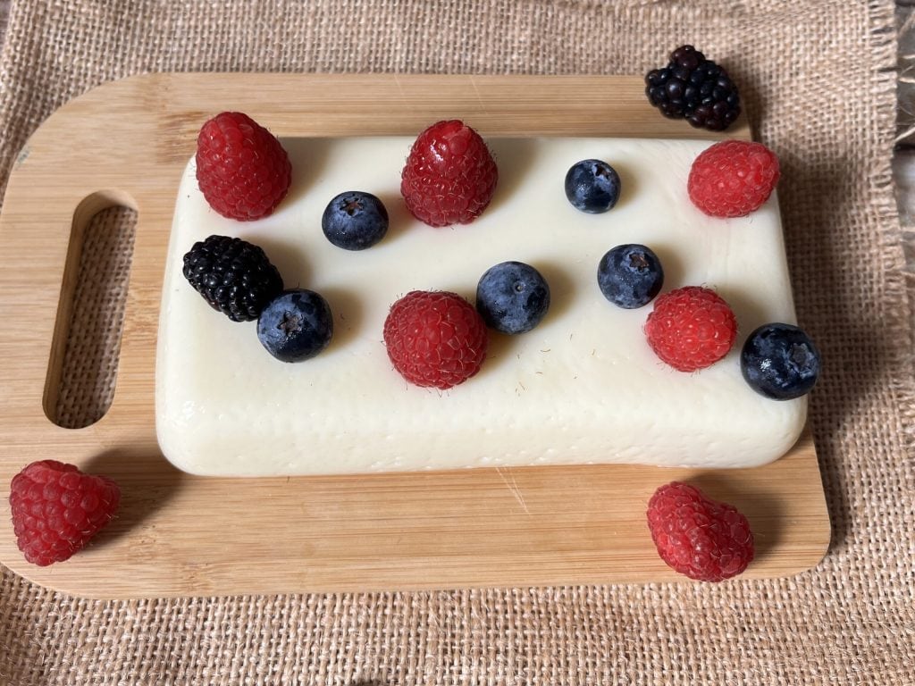 Nuestro Pudin de vainilla sin lactosa está listo. Desmoldamos y decoramos con frutos del bosque frescos.