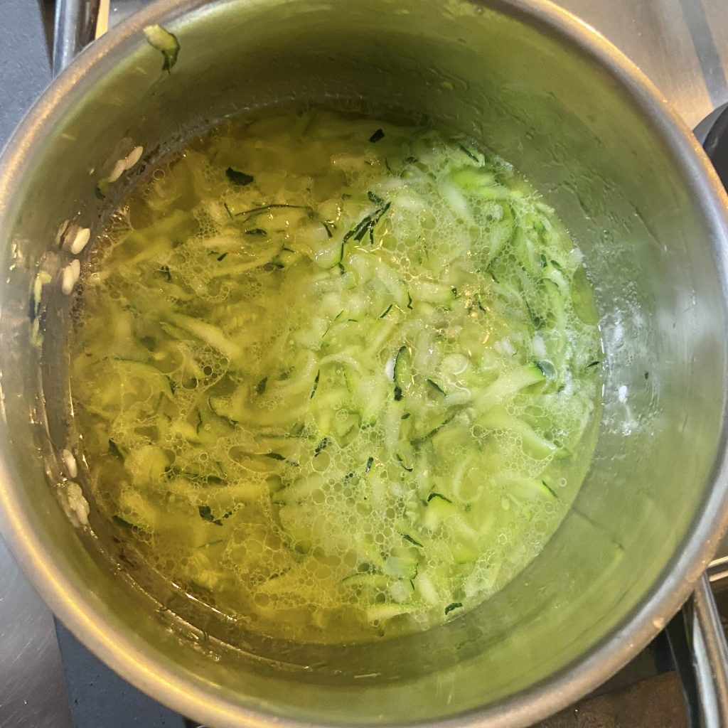 Añadimos los calabacines rallados y cocinamos por unos minutos.