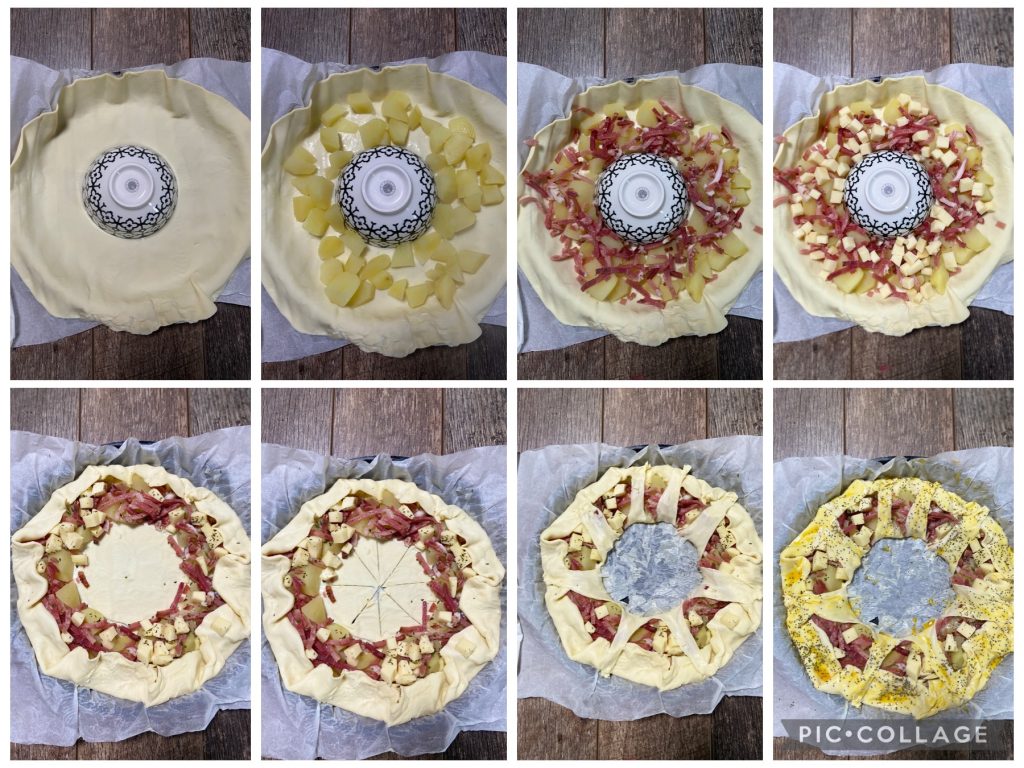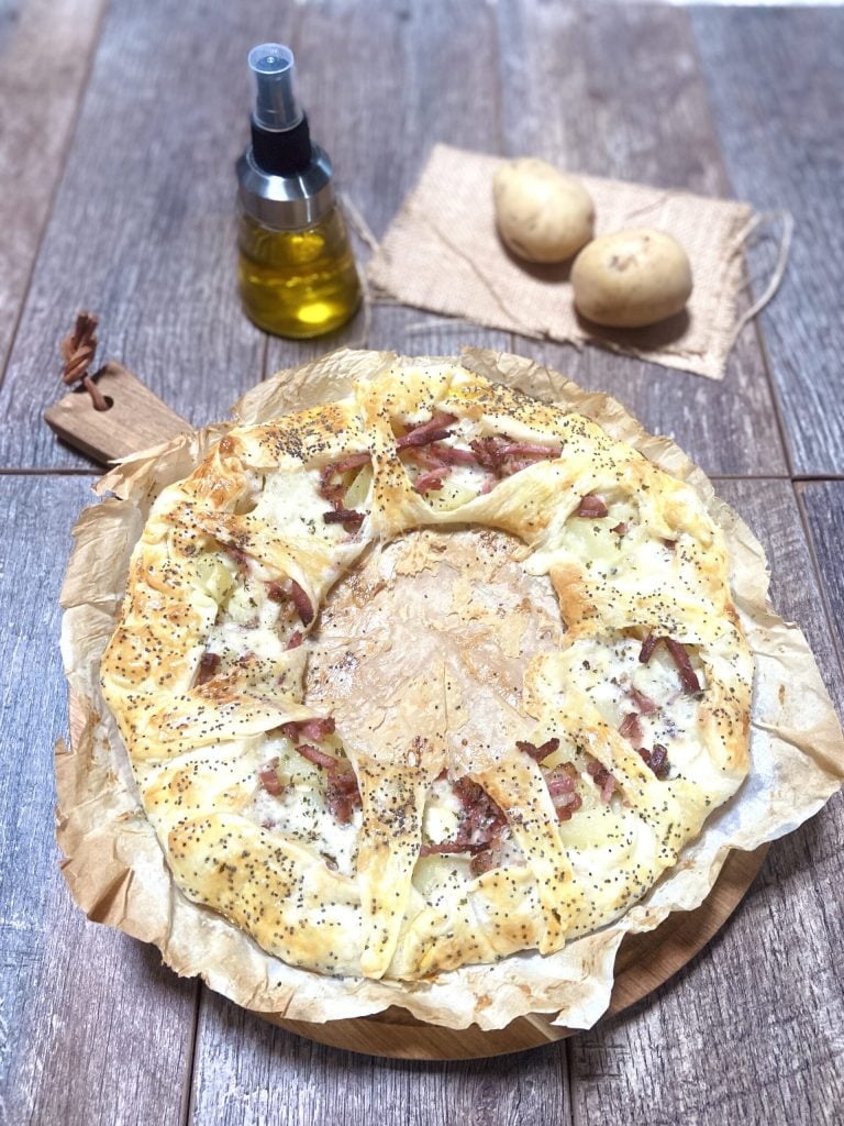 Rosca de hojaldre con speck y patatas.