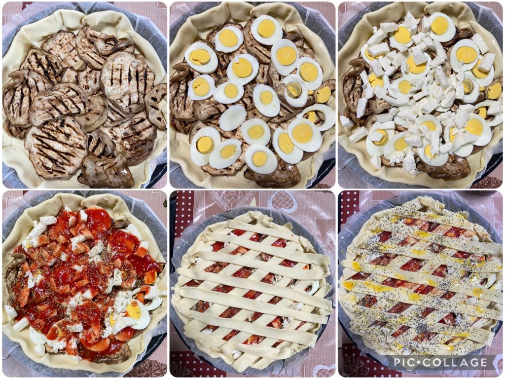 Las disponemos sobre la tarta salada creando un enrejado. Pincelamos la superficie con la yema de huevo batida y horneamos. Cocinamos a 180/185 grados durante unos 30 minutos.