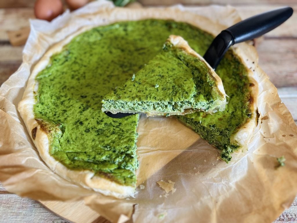 Tarta salada con espinacas trituradas. Receta con el truco ingenioso.