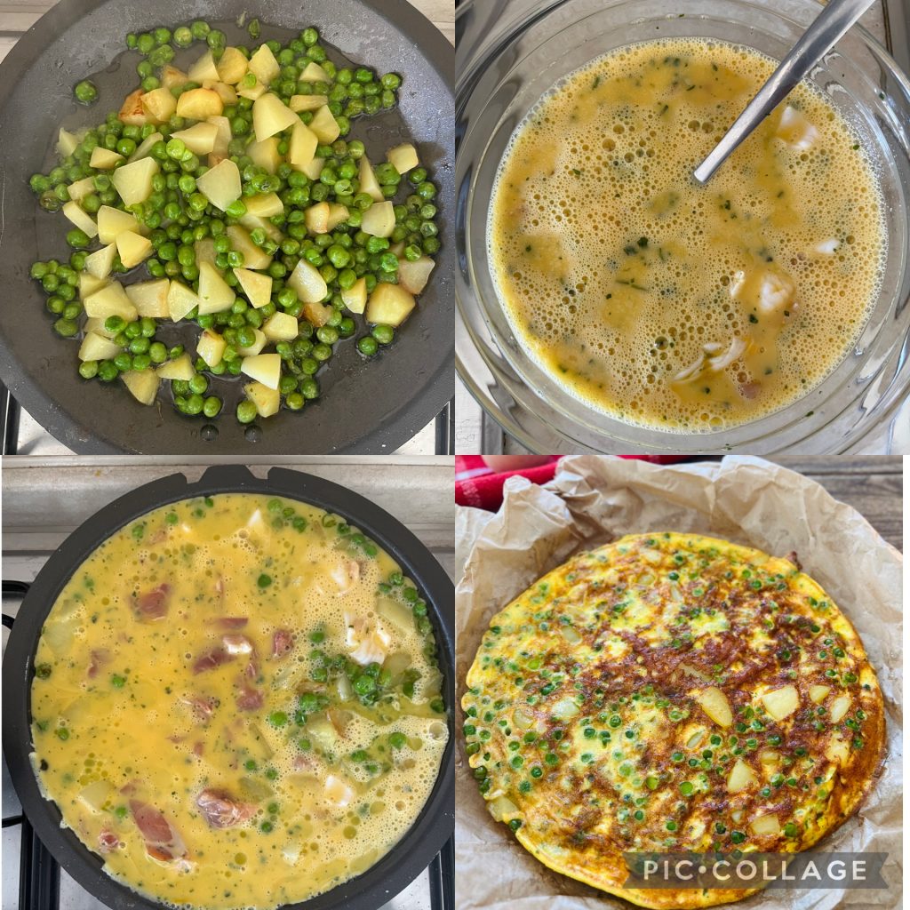 Vierta la mezcla de huevos en la sartén con las patatas y los guisantes, nivele con una cuchara y cocine a fuego medio-bajo durante unos 6/7 minutos, hasta que la base de la tortilla esté dorada y la mezcla se haya cuajado.