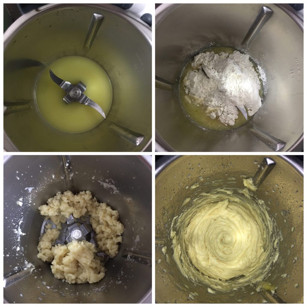 Mientras tanto, precalentamos el horno a 200 °C y forramos una bandeja con papel de horno.Colocamos el vaso en su alojamiento y, con las cuchillas en movimiento, añadimos los huevos uno a uno por el bocal.