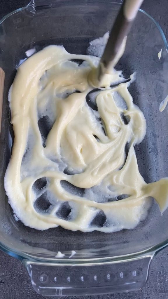 A continuación, toma una fuente de vidrio y unta una base de crema con la ayuda de una espátula de silicona