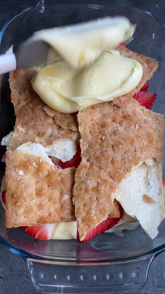 Continúa formando una nueva capa de hojaldre, crema, fresas, realizando exactamente el mismo paso que hiciste anteriormente