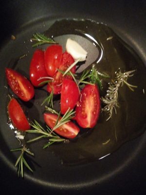 • Lavar y cortar en cuartos los tomates cherry, pelar el ajo y limpiar el romero, sofreír todo con un poco de aceite de oliva virgen extra en una sartén grande.