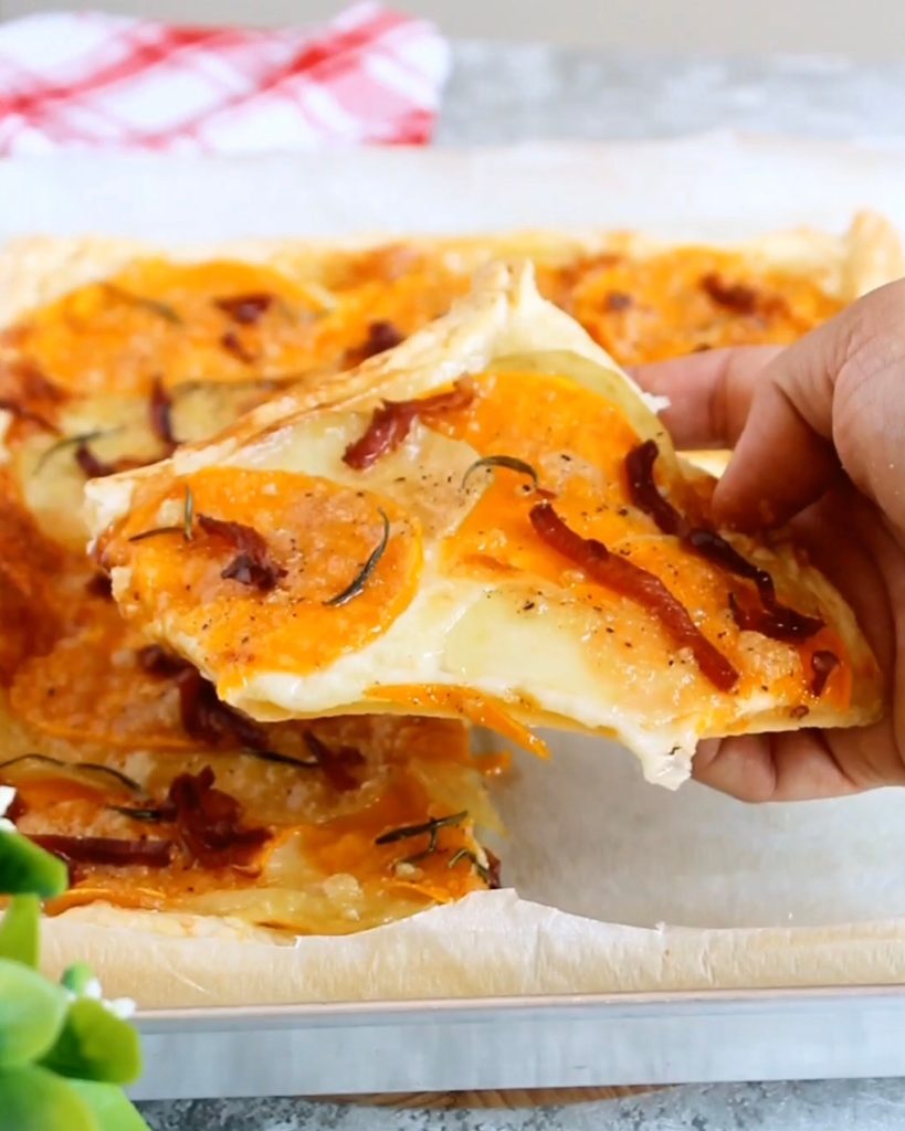 Se prepara realmente en poquísimos minutos, ya que tanto la calabaza como las patatas se distribuirán crudas sobre la masa antes de hornear; lo importante, para asegurar que todos los ingredientes se cocinen bien y al mismo tiempo, será cortar la calabaza y las patatas en rodajas muy finas.