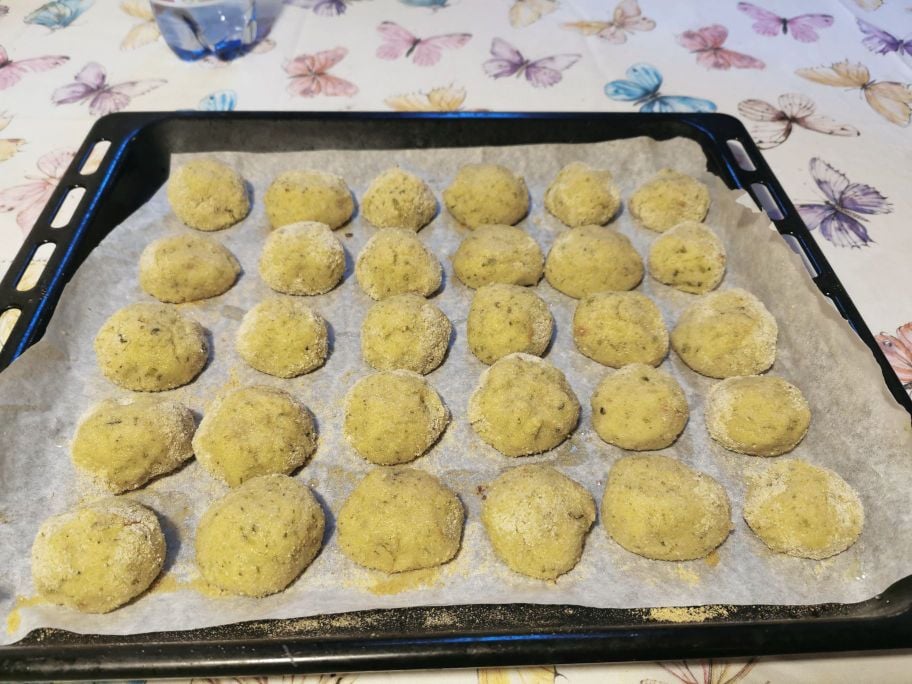 Forma muchas bolitas, rodándolas con las manos y luego sumérgelas en el pan rallado. Colócalas en una bandeja forrada con papel de horno con un hilo de aceite en cada albóndiga.