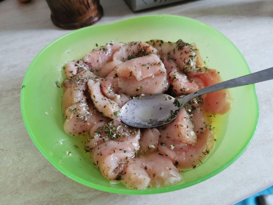 Ponemos los bocaditos de pollo en una marinada compuesta de aceite, ajo y romero picado. Dejamos en este adobo durante unos 15 minutos